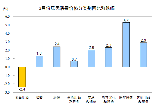 3 月份,其他七大類價(jià)格同比均有所上漲。其中,醫(yī)療保健、其他用品和服務(wù)、居住、教育文化和娛樂(lè)、交通和通信、衣著、生活用品及服務(wù)價(jià)格分別上漲 5.3% 、 2.9% 、 2.4% 、 2.3% 、 2.0% 、 1.3% 和 0.7% 。