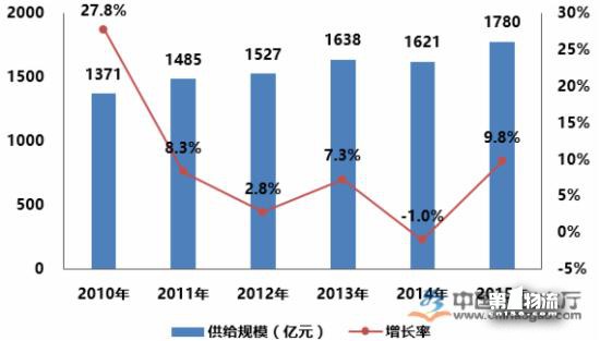 2010-2015年間中國商用冷鏈?zhǔn)袌鲆?guī)模整體處于上升態(tài)勢,供給規(guī)模從2010年的1371億元增長至2015年的1780億元;但是,2010-2015年期間,中國商用冷鏈供給規(guī)模增長率波動(dòng)較大,其中2014年的供給規(guī)模下降1.0%,商用冷鏈供給規(guī)模的下降主要是由商用冷柜等相關(guān)產(chǎn)品供給規(guī)模下跌導(dǎo)致。