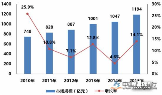受到零售、食品、冷鏈物流行業(yè)等發(fā)展影響,2010-2015年,中國商用冷鏈?zhǔn)袌霰3种粩嘣鲩L的態(tài)勢,但是受到宏觀經(jīng)濟(jì)和市場需求波動(dòng)等不穩(wěn)定因素的影響,增長率有較大幅度的波動(dòng)。
