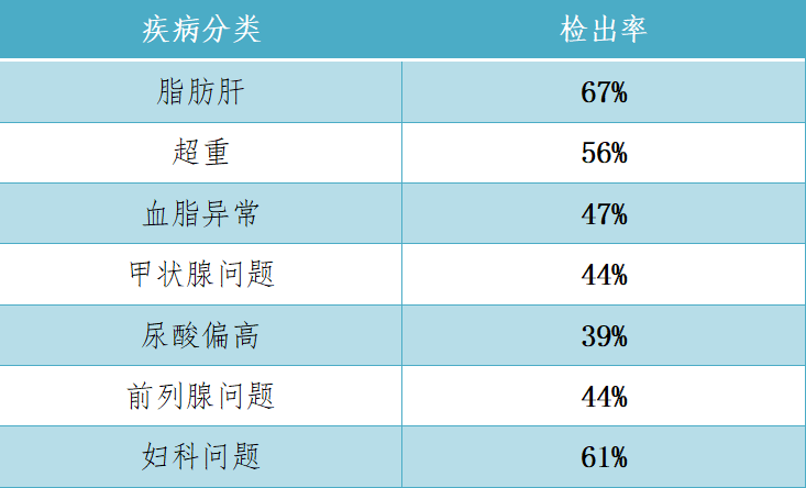 本次體檢統(tǒng)計(jì)顯示,發(fā)病高居榜首的是脂肪肝(約占67%),第二位的是超重(約占56%),第三位的是血脂異常(約占47%),第四位的是甲狀腺問題(約占44%),第五位的是尿酸偏高(約占39%)。另外,男員工前列腺問題(約占44%),女員工婦科問題(約占61%)。