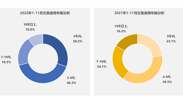 除銷量外,二手車的保值率也是繞不開(kāi)的話題。由于二手車年限特征明顯,車齡對(duì)車價(jià)影響較大。從消費(fèi)者偏好看,2022年1-11月,3-6年車齡的二手車交易占比40.3%,3年內(nèi)車齡二手車占比30.2%。新能源方面,4年以內(nèi)車齡二手車占比更是達(dá)到80%以上。
